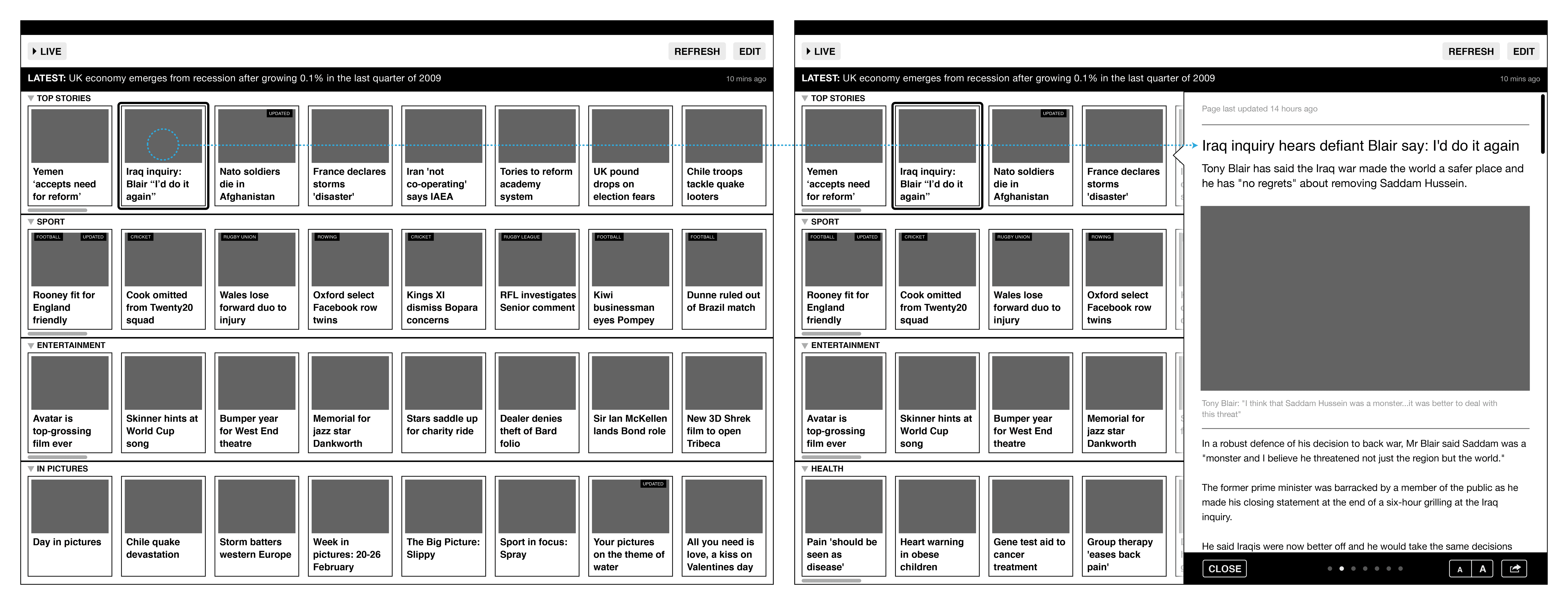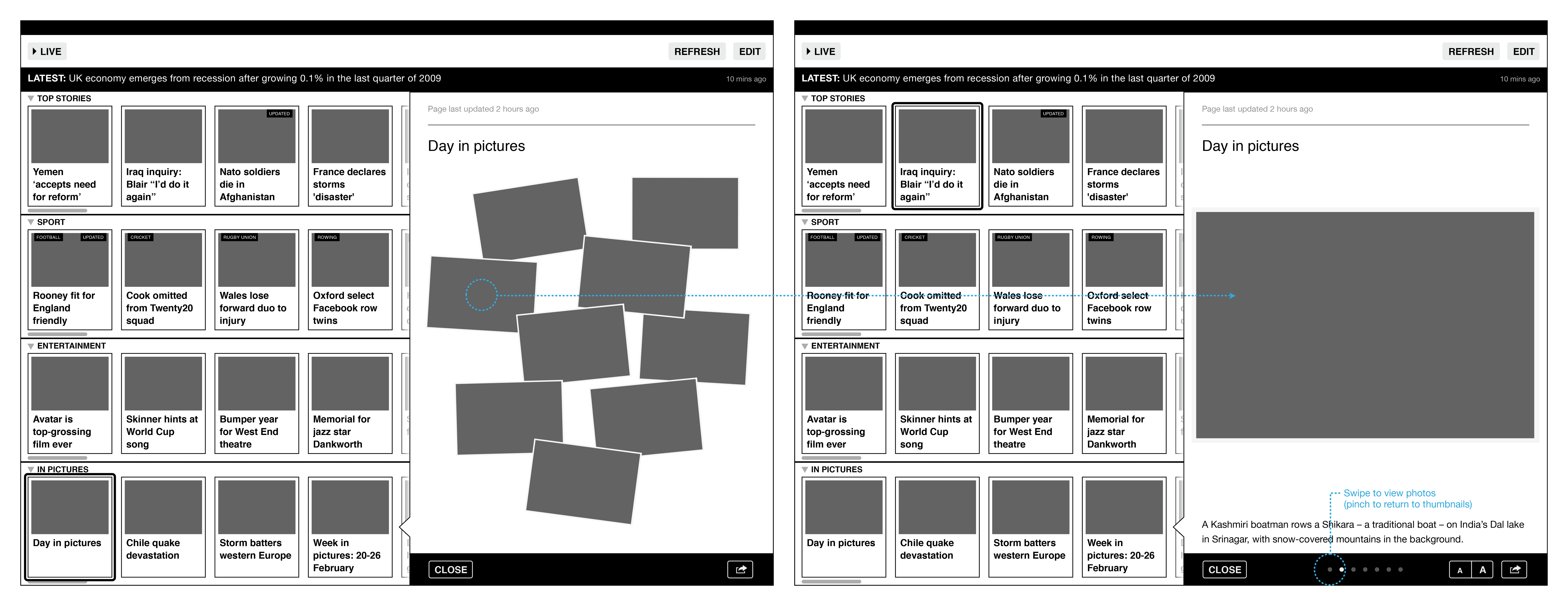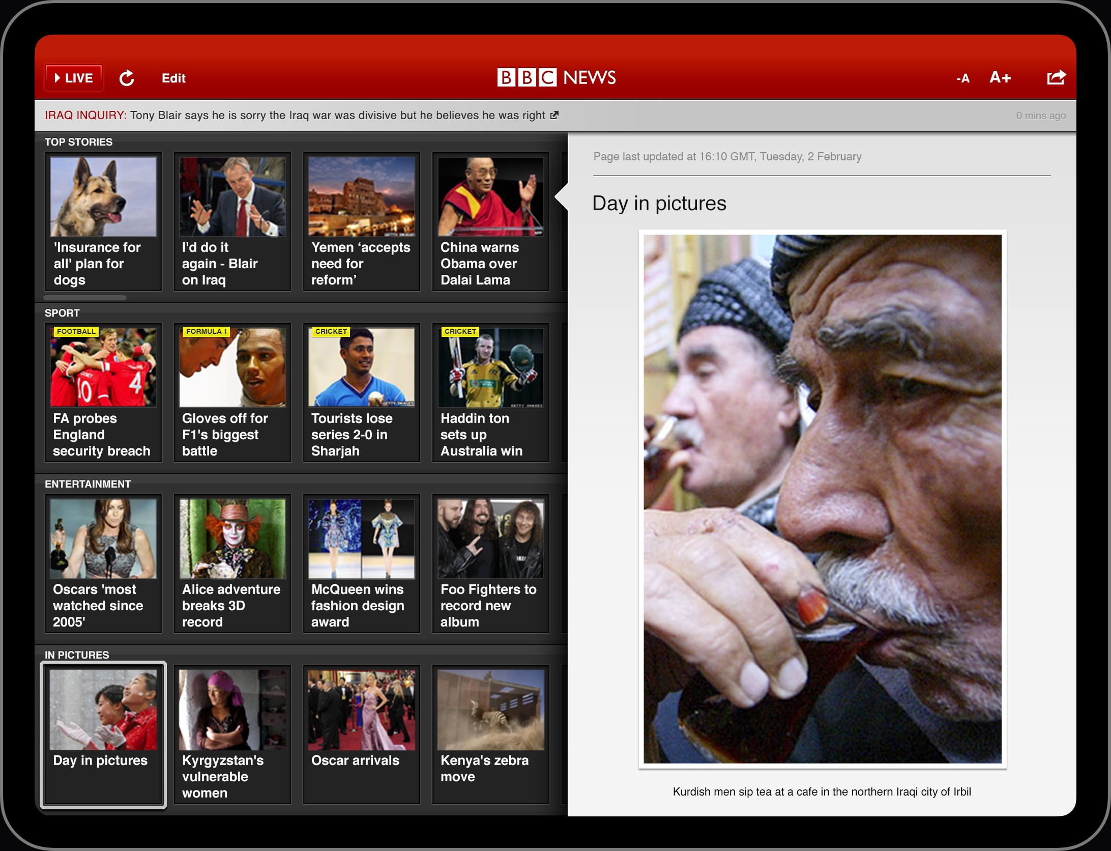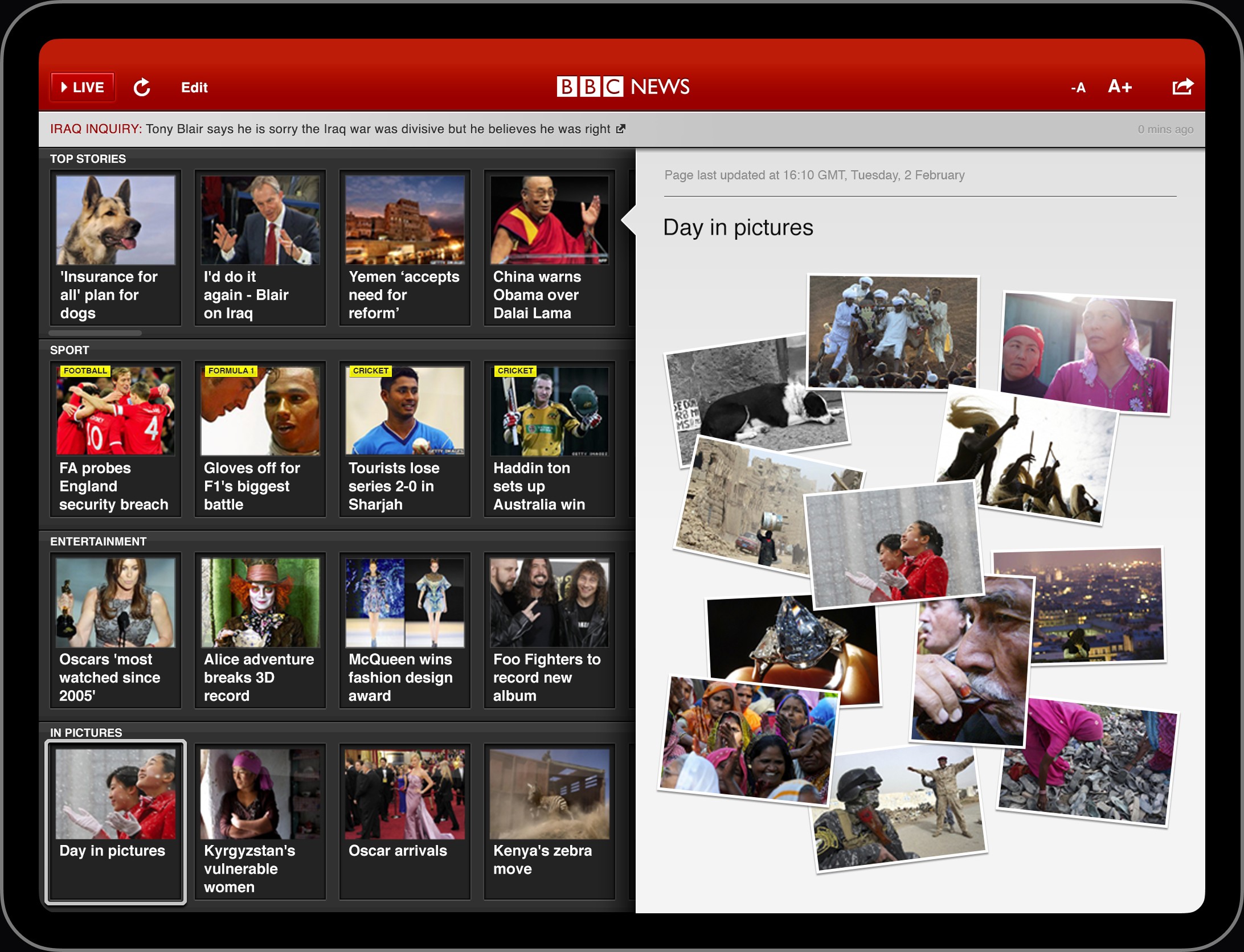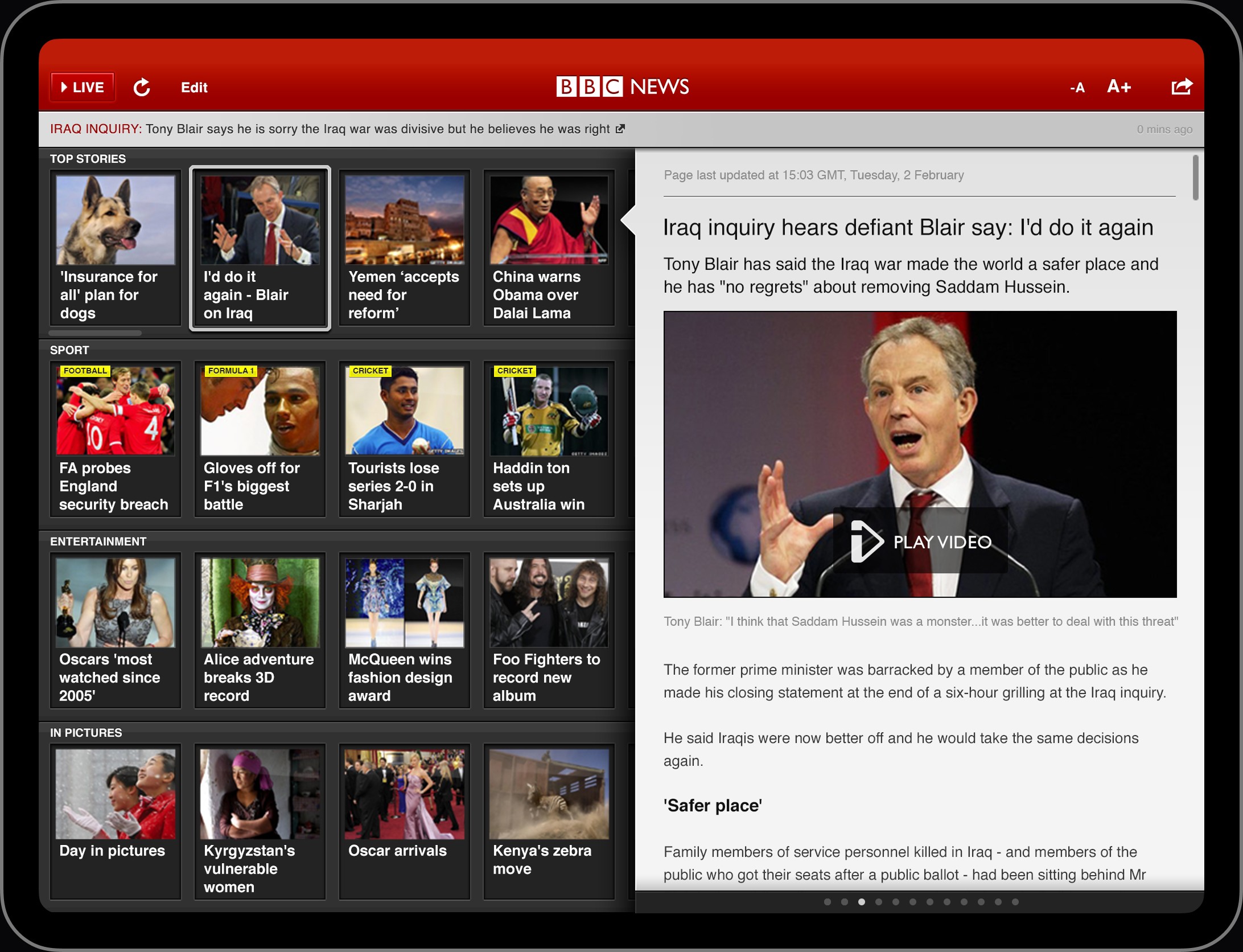 Prior to the launch of the iPad, the BBC had no App Store presence. The objective was to create a one-of-a-kind inaugural app that would set the BBC apart from all other news sources. The stakes were high, as the app had to be live in the App Store the same day the iPad became available worldwide. We had only three months to design a flagship experience for a device that no one had yet held.